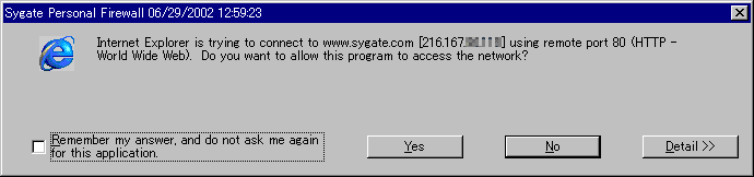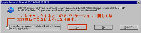 Explorerが外部へ接続しようとしています。あなたはネットワークへのこのプログラムのアクセスを許可しますか?」と尋ねています。この場合は、「Yes」を選択しないとインターネットには接続できなくなります。ここで、「No」を選択した場合は、結果的にSygate