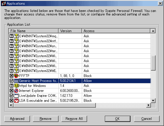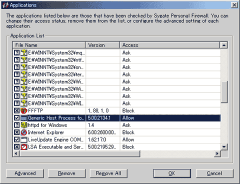 「Tools」→「Applications」で表示される画面。今までに起動したことのあるプログラムの全てがこのウィンドウに登録されるようになっています。チェックボックスのチェックを何回かクリックすると「Allow」「Block」「Ask」の3段階で切り替えられます。現在、起動していないプログラムの通信可否の設定を行う際にはこのウィンドウを活用すると良いでしょう。