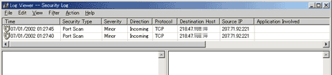 Personal Firewallのログの中でも特に重要な役割を果たすログです。以下の図がセキュリティログの画面ですが、上のウィンドウが実際にどのような攻撃を誰から、どのポートに、どのプロトコルを狙ったものなのかとかいった詳細な情報が表示される画面です。そして、下にある2つのウィンドウは選択した攻撃に対してのより詳細な情報が表示されます(例:Somebody
