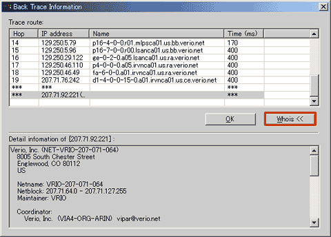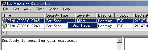 実は、このログ機能には「BackTrace」という非常に便利な機能が実装されています。この「BackTrace」機能を使用すると、その攻撃元を追跡することができるようになり、さらにWhoisデータベースを使用して、犯人を特定するための手がかりを得ることができます。「BackTrace」は、ログを右クリックして「BackTrace」をクリックするか、ログを選択して「Action」→「BacTrace」をクリックして使用することができます。つまり、ネットワークコマンドで言うところの「TRACERTコマンド」と同様のことを実現しています。なお、ログが多すぎて見にくいといった場合に、「Filtering」メニューを利用することで、1日別、2日前、3日前、1週間前、2週間前、1ヵ月前、全てのログと7段階で表示方法を変えることができます。