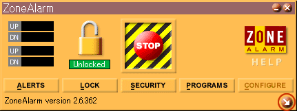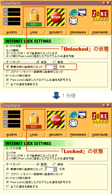 ZoneAlarmでは、「Unlocked」(鍵のかかっていない状態)と「Locked」(鍵のかかっている状態)を切り替える事ができます。デフォルトでは「Unlocked」の状態になっていますが、セキュリティをより強固にするためには、「Locked」の状態にしておいた方が良いでしょう。「Locked」の状態にする事で指定したプログラム(主にアプリケーション)以外は、インターネットに勝手に自動接続しないようになります。