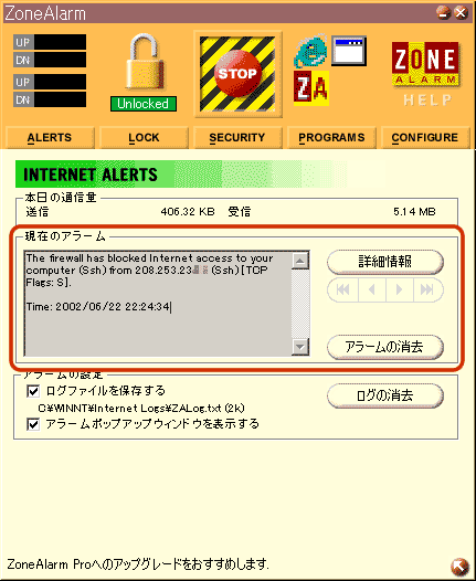 なお、このアラーム画面に表示される警告メッセージが全てWAN側からのLAN側への接続に対して記述されるわけではなく、LAN側からWAN側への接続をブロックした際にも表示されるようになっています。例えば、シマンテック製品であるNorton