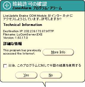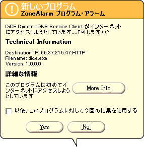 Meeting、ICQ、IRC、P2Pソフトなど)は、インターネットへの接続許可をしないと使用することができないので必ず、以下のような「許可をするのか、それとも拒否をするのか」といったポップアップ画面が現れます。特定のアプリケーションをインターネットにアクセスをしてもよい場合は、「Yes」をクリックしてください。もしも、見覚えのないプログラムがインターネットに自動的に接続を試みた場合は、その接続を試みようとしたプログラムを見つけ出して、それが安全だと判明した時に初めて接続を許可するようにしてください。また、インターネットにアクセスしようとするプログラムが安全であるとわかっている場合には、「以後、このプログラムに対して今回の結果を使用する」にチェックを入れてから「Yes」をクリックするようにしてください(なお、この設定は「PROGRAM」メニューで変更が可能です)。