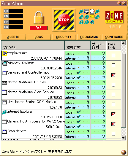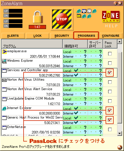 では、実際にプログラムごとに「パスロック」の指定をしていきます。ZoneAlarmの「PROGRAM」メニューをクリックしてください。ZoneAlarmインストール後に起動したことのあるプログラムが一覧表示されています。そこで、許可したいプログラムに対して「パスロック」のチェックボックスにチェックをつけ、チェックマークが表示されればパスロックの指定は完了です。「Locked」モードにした状態で、Internet