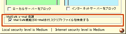 「MailSafe機能がE-MAiL添付スクリプトファイルを検疫する」にチェックボックスにチェックをつけると、メールに添付されたマイクロソフト社のVisualBasicのスクリプトを(VBS