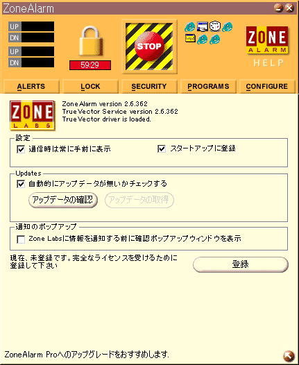 ZoneAlarmは5つの設定パネルにわかれており、それぞれ「ALERTS」「LOCK」「SECURITY」「PROGRAMS」「CONFIGURE」のパネルがあります。以下ではそれぞれのパネルごとに解説をしていきます。