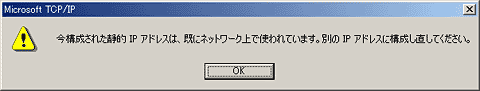 ARPは通常はほとんど意識する必要のないプロトコルですが、OSの設定ミスやその他もろもろのミスがないかどうかを確認する際には非常にその効果を発揮します。例えば、TCP/IPを固定設定(静的に対応付け)する場合に、間違えてLAN内にある特定のコンピュータと重複するIPアアドレスを指定してしまった場合、以下の図のように「今構成された静的IPアドレスは、既にネットワーク上で使われています。別のIPアドレスに構成し直してください」といったダイアログボックスが表示されます。