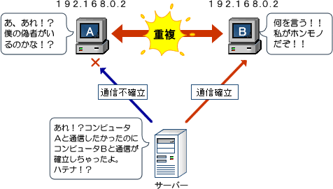 このダイアログボックスが出た場合、LAN内にあるコンピュータの台数が少なければ比較的、容易に問題を解決することができますが、数十台、数百台レベルのコンピュータが存在する場合には、この画面で表示された情報だけでは手がかりが少なすぎて捜索が難航してしまいます。また、このままIPアドレスが重複したまま使用していると同じIPアドレスを持つ2台のコンピュータの内、どちらかのコンピュータが接続を確立することができなくなるという事態が発生します。このような場合、通常はその重複したIPアドレスを持つコンピュータを探し出すか、もしくはそのコンピュータのIPアドレスを暫定的に変更するといった対策をとることもあります。