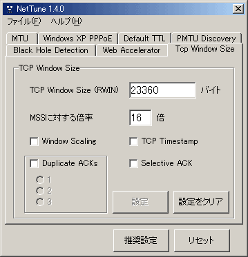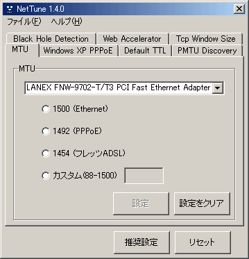 MTUの最適値がわかったら実際にレジストリを編集して値を変更するわけですが、間違って編集してしまうとシステムに異常をきたす恐れがあります。また、レジストリは極力、自分ではいじりたくないという方もいるでしょう。ここではいくつか作者も使用したことのあるMTU値を変更することのできるツールを一部、紹介しておきます(他にもたくさんあります)。使い方はいたって簡単なので各自で試してみるとよいでしょう。なお、これらのツールにはウィンドウサイズ(RWIN値)を設定する項目もあり、より一層の相乗効果も期待できます。一般的に、RWIN値はMTUの整数倍に設定するのが良いといわれています。より細かく設定したい方は作者のホームページのヘルプか添付のヘルプを参照するかしてください。とことんまでスピードを追求したいというかたは以下のリンクが非常に参考になるので是非、訪れてみてください。