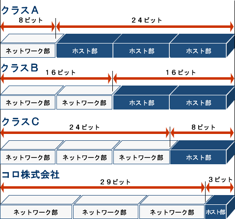 IPアドレスとその仕組み」を参照)。IPアドレスは32ビットの表記で表されるため、ホスト部が3ビットであるとすれば、ネットワーク部は必然的に29ビットと算出することができ、この29ビットという数値がコロ株式会社の