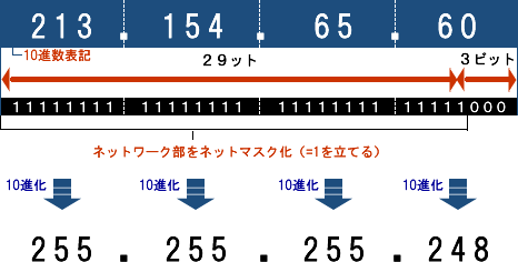 000」、10進数表記で「255.255.255.248」と表されるのです。