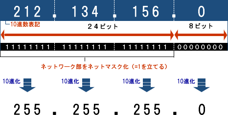 ネットマスク(サブネットマスク)とはその名の通り、「ネットワーク部」にマスクをかけることです。例えば、「212.134.156.0~212.134.156.255」のアドレスブロックを取得している例で説明します。これは256個のIPアドレスを取得しているためクラスCに相当し、プリフィックス値で表記すると「212.134.156.0/24」ということになります。プリフィックス値は24ビットであると算出されているので、これをネットマスク化してみます。ネットマスク化とは「