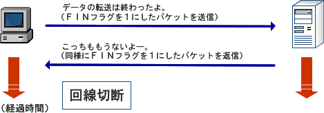 相手側も送信するデータがなければ、同様にFINフラグを「1」にしたセグメントを返してきます。その段階でバーチャルサーキットの接続が切断されます。この時に何度接続しようとも正常にデータが送れなかった場合は、RSTフラグを「1」にしたセグメントを相手に送信し、回線を強制的に切断します。