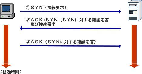 flag)パケットを送信、③クライアントからACKパケットを送信、という3段階の手順を踏んだ3ウェイハンドシェイク(3Way