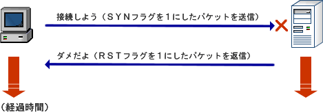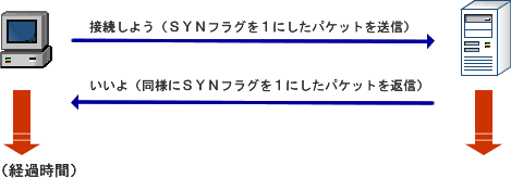 通信を行う側が、SYNフラグを「1」にしたセグメントを相手に送ります。受け取った側は通信できる状態にあれば同様に「1」のデータを返します。もし、通信できなければRST(Reset)フラグを「1」にしたセグメントを返します。