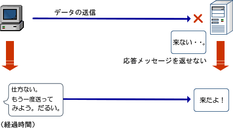 なんらかの原因によって受信側より一定時間、応答メッセージが返ってこない場合はもう一度データの再送を行います。