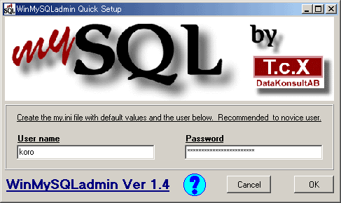 「C:\mysql\bin」内にあるwinmysqladmin.exeをダブルクリックしてください。以下図のような画面が現れます(初回時のみ)。MySQLにアクセスするためのユーザー名とパスワードを記入してください。