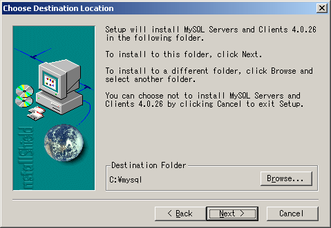 インストール場所をシステムドライブ直下(例:C:\MySQL)に指定して、「Next>」をクリックします。