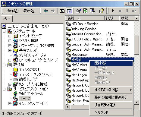 「コントロールパネル」→「管理ツール」→「サービス」からMySQLを右クリックして、表示されたコンテキストメニューから「開始」を選択します。この時、サービスにMySQLが追加されていない場合は、コマンドプロンプトから以下のコマンドを入力すれば追加されます。