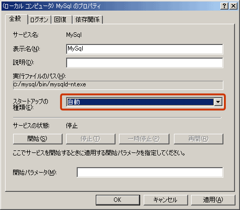 MySQLを自動起動するように設定しておきます。「コントロールパネル」→「管理ツール」→「サービス」からMySQLをダブルクリックしてください。以下のような画面が現れたら、「スタートアップの種類」のプルダウンメニューから「自動」を選択して「OK」をクリックしてください。これで、Windows起動時にMySQLが自動的に起動するようになります。