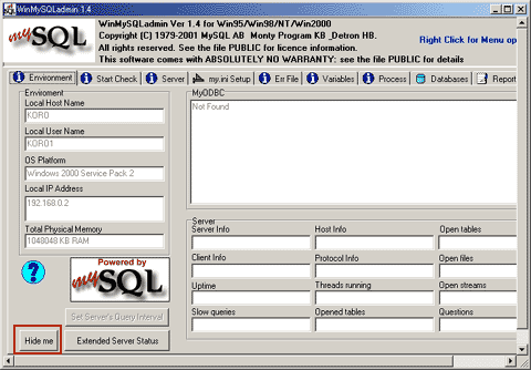 me」を選択します。設定をGUIベースで編集していくことができるようになります。なお、MySQLをもう一度タスクトレイに収納する際は赤枠で囲まれた「Hide