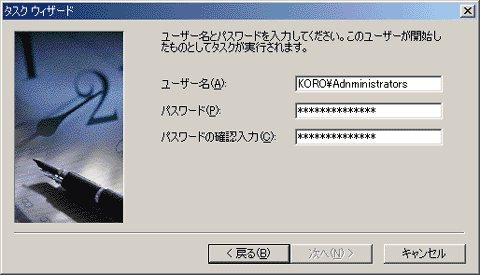 ユーザー名とパスワードを入力し、「次へ>」をクリックします。なお、パスワードを入力する場合は、Windowsログオン時のパスワードを正確に入力してください。