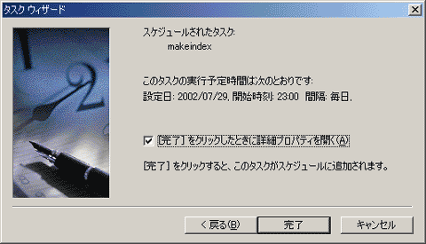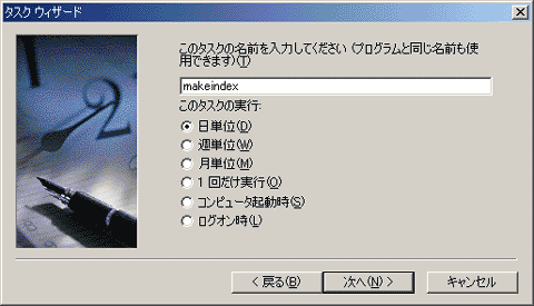 実行するプログラムから「makeindex.bat」を選択し、タスクの実行間隔を「日単位」とします。「次へ>」をクリックします。