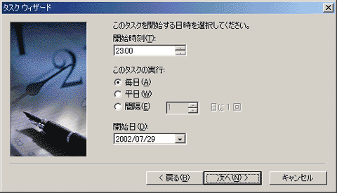 開始時刻ととタスクの実行間隔を指定し、「次へ>」をクリックします。