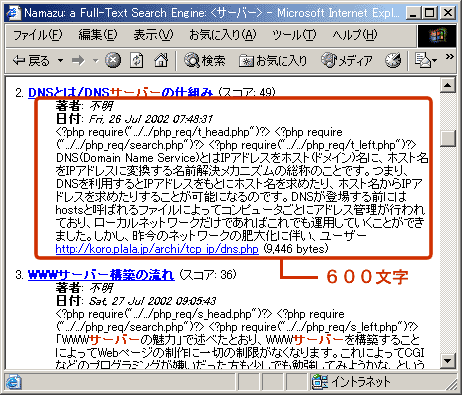 Namazuで検索をかけた際に表示される要約の文字数はデフォルトでは200文字となっています。この文字数をもっと増やしたい場合は「C:\namazu\etc\namazu」ディレクトリ内の「mknmzrc」を編集します。「mknmzrc」を開いて以下の部分を適当な値に設定してください。