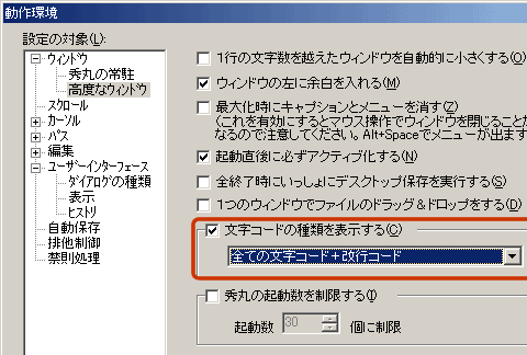 「その他」→「動作環境」→「高度なウィンドウ」で、「文字コードの種類を表示する」のプルダウンメニューから「全ての文字コード+改行コード」を選択します。これで、ウィンドウの左上からそのファイルの文字コードと改行コードを確認できるようになります。