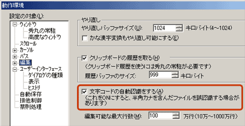 次に「その他」→「動作環境」→「編集」で「文字コードの自動認識をする」のチェックボックスにチェックをいれます。