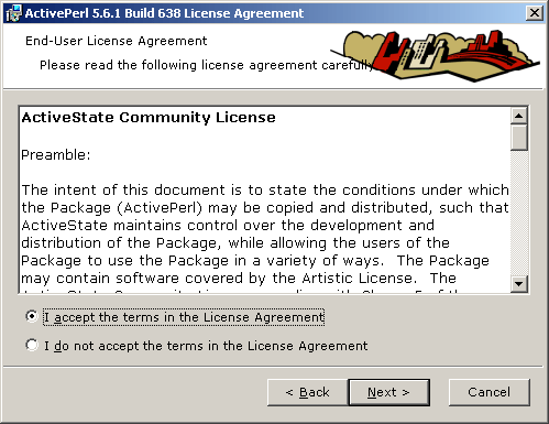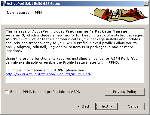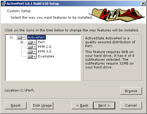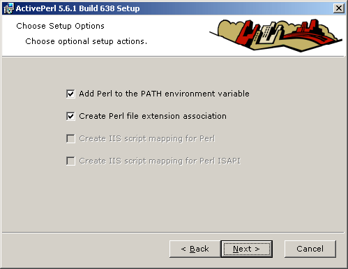 両方のチェックボックスにチェックをつけたまま、「Next>」をクリックしてください。「Add Perl to
