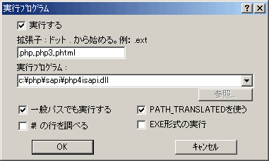 「拡張子」に「.php,.php3,.phtml」、実行プログラムに「c:\php\sapi\php4isapi.dll」を入力します。