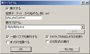 「拡張子」に「.php,.php3,.phtml」、実行プログラムに「c:\php\php.exe」を入力します。CGI実行版として使用する場合には「PATH