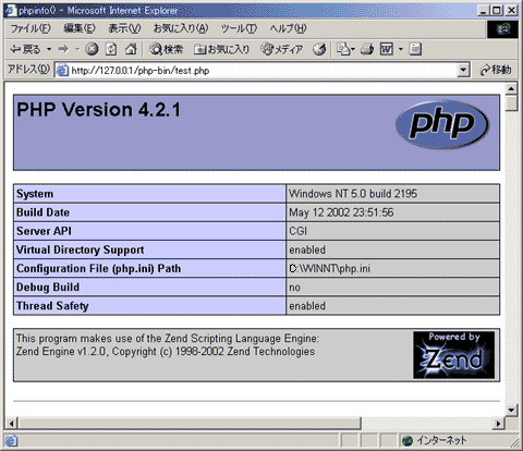 Server Errorになりやすくなる可能性も含んでおり、いくつかのバグも確認されているようです。パフォーマンスよりも安定性を選ぶのであれば、CGIバイナリとして実行することをお勧めします。ただし、CGIインタープリタとして使用した場合は、他の言語で作成したCGIと同様に、パフォーマンスはかなり低下します。逆に、SAPI版ではWebサーバーのモジュールとして組み込んでいるため、負荷も大幅に小さくなり、高速にスクリプトが実行されます。
