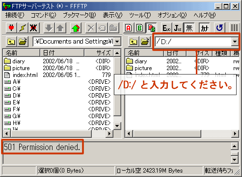以下の画像のようにステータスバーに「501 Permission denied.」のようにアクセス権がありませんという表示がされたはずです。これでログインしたときのディレクトリ以外の階層へは移動できないことを確認することができました。もしも、不幸にも上位階層へ移動できてしまった場合は、FTPサーバーソフトの設定を見直す必要があります。