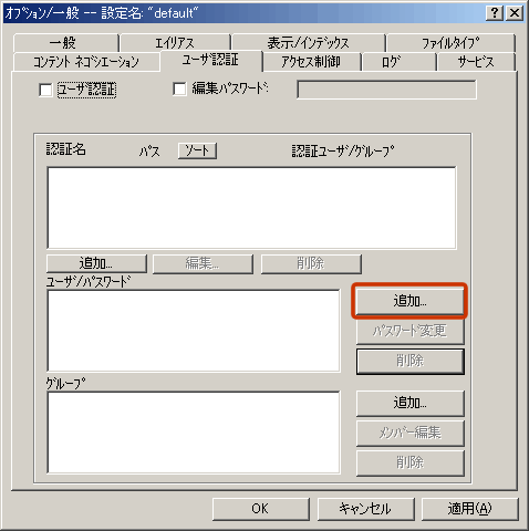 まず、今回は「/photo」というディレクトリにアクセス制限をかけ、ユーザ名を「taro」、パスワードを「pass」と入力するように設定していきます。まず、赤枠で囲んである「追加」をクリックしてください。