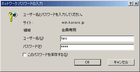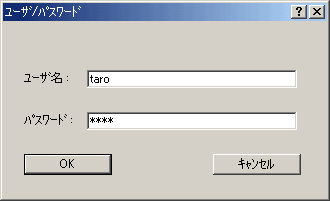 以下のような画面が現れるので、ユーザ名「taro」、パスワード「pass」を入力して「OK」をクリックしてください。パスワードは暗号化されて表示されます。ここでは、練習なので単純なパスワードを設定していますが、実際には推測しにくいパスワードを設定してください。