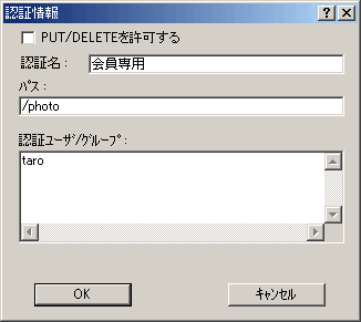次に認証名の「追加」をクリックしてください。以下のような画面が現れたら、認証名に任意の名前(認証の際にダイアログに表示されます)を入力し、パスに「/photo」、認証ユーザ/グループに「taro」と入力して「OK」ボタンをクリックしてください。