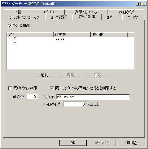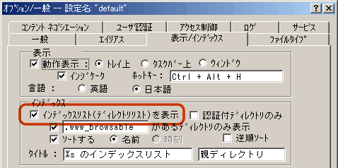 示/インデックスでは、フォルダ内にindex.htmlが存在しない場合に、特定のファイル、ディレクトリを一覧表示させることができます。MP3や仲間内で撮影した写真などを公開したいけど、いちいちHTMLを作成するのは面倒くさいなどの場合に非常に便利ですが、セキュリティの観点からも通常はチェックをはずしておきましょう。なお、特定のディレクトリに対してのみインデックス表示をさせたい場合には、各ディレクトリ内に「.www_browsable」という名前のファイルを格納しておくことで可能となります。その場合は、「.www_browsableがあるディレクトリのみ表示」にチェックをいれておく必要があります。また、「.www_browsable」の名前を変更することも可能です。