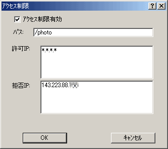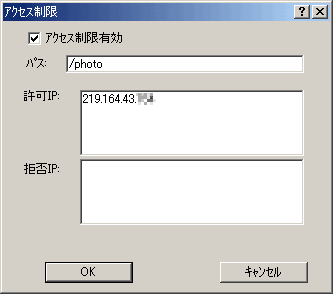 以下のような画面が現れます。下記の設定は特定のIPアドレスのみを許可する場合の設定例です。「パス」にアクセスさせたくないディレクトリのパスを入力し、「許可IP」に許可させたい人のIPアドレスを入力するようにします。これで「219.164.43.XXX」の人だけにサーバーを公開することができるようになります。