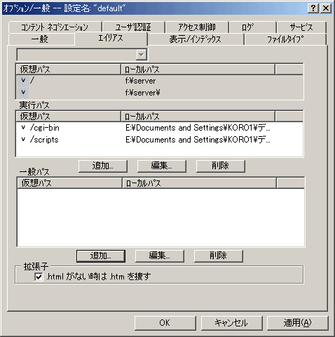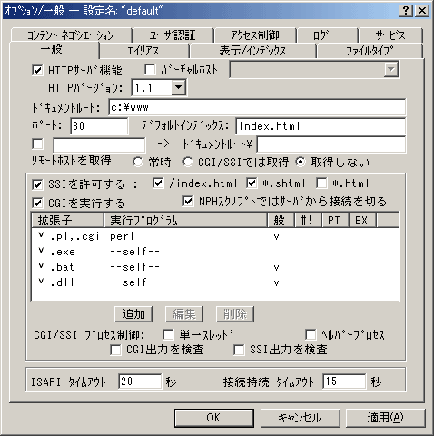 デフォルトで最初に表示される(読み込まれる)インデックスファイルの名前を指定します。つまり、「c:\www」フォルダの中で最初に開きたいファイルが「index.html」であった場合は、空欄に「index.html」と入力します。もし、最初に表示したいHTMLファイルの名前が「welcom.html」だとしたら、デフォルトインデックスの空欄に「welcom.html 」と記入します。