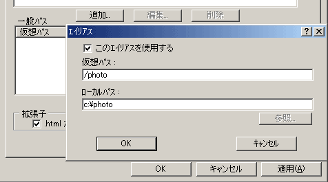 以下のような画面が現れますのでここで仮想パスとローカルパスを指定します。ここでは仮想パスに「/photo」、ローカルパスに「c:\photo」を指定しています。このように入力すると、「/photo」にアクセスした場合に「c:\www\photo」ではなく、「c:\photo」の方が表示されるようになります。