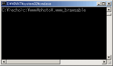 「echo>c:\www\photo\.www_browsable」と入力してリターンキーを押します。するとそのフォルダ内に「.www_browsable」というファイルが作成されます。ここでは「photo」というフォルダの中に作成しているので、このフォルダのみが一覧表示されるようになります。
