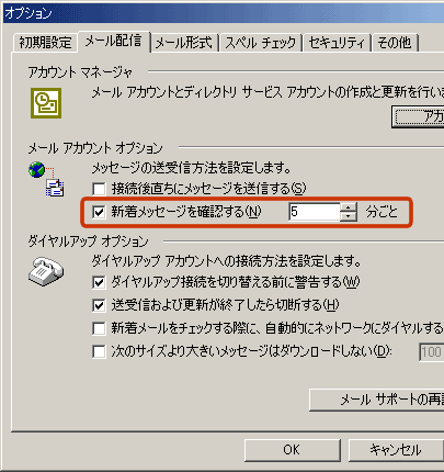 オプションタブから「メール配信」タブをクリックしてください。赤枠で囲まれた「新着メッセージを確認する」にチェックを入れ、「5分」ごとにすれば設定は完了です。これで、5分ごとにプロバイダのPOPサーバーに接続しにいくようになります。注意したいのは、OutlookExpressを起動したままでないとこの機能は有効になりません。