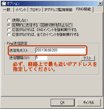 203.138.68.203」を入力します。ここで、注意してもらいたいことは必ず自分が加入しているプロバイダへの到達経路の中から、もっとも近い場所で、且つ逆引きができているIPアドレスを指定してください。自分が加入している以外のプロバイダに送信すると、ホップ数も無駄に多くなり、関係のないプロバイダへ余計な負荷をかけることにもなるので、ネットワークトラフィックを引き起こす元にもなりかねません。「送信間隔」は基本的には5分間隔で問題ありませんが、プロバイダのサポートセンターに電話して、何分で自動切断されるのかを問い合わせてみるのもいいかもしれません。