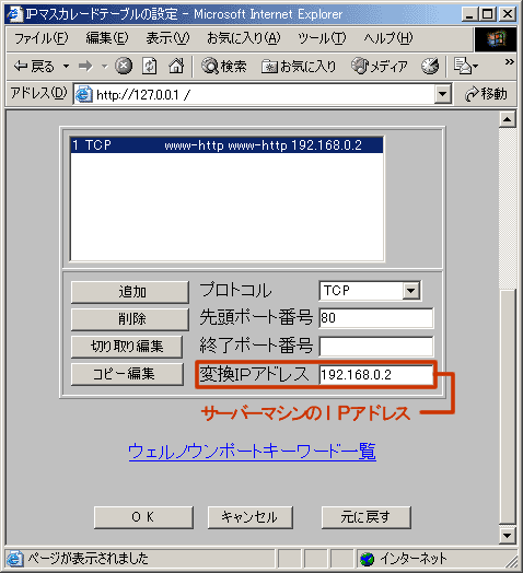 設定といえども、インターネットに接続する設定などは各自マニュアルを見てもらうこととして、ここではサーバーを公開するにあたって必ず設定する必要のあるNATテーブル(IPマスカレードテーブル)について解説します。NATテーブルを正しく設定することによってサーバー公開だけではなく、IRCやネットワーク対戦ゲーム、NetMeeting、MSN