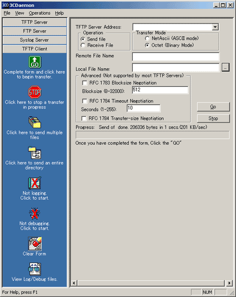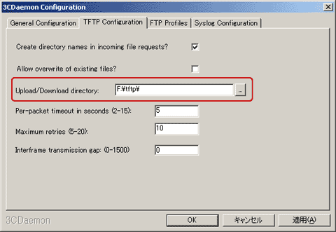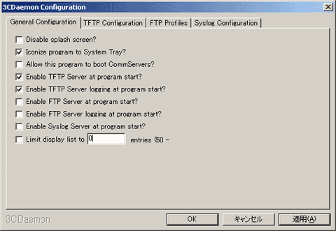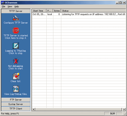 3CDaemonは3Com謹製のツールで、TFTPクライアントだけではなく、TFTPサーバー、FTPサーバー、 syslogサーバーがセットになったソフトウェアです。FTPサーバーと