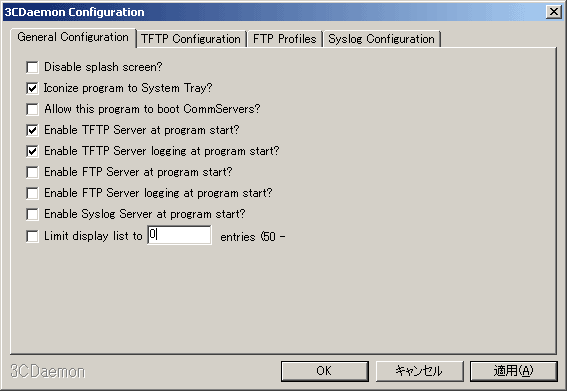 Configuration」タブは3CDaemon全体に影響する設定を行います。TFTPサーバーの設定は、「TFTP