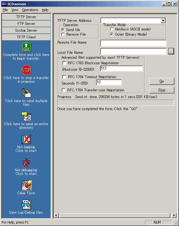 TFTP(Trivial File Transfer Protocol)とは、FTPの機能を単純化したプロトコルのことで、FTPに比べて使用できる機能も非常に制限されています。TFTPには、ディレクトリ一覧を閲覧する機能はなく、できるのはファイルの送受信のみです。なので、TFTPは、転送したいファイルとそのファイルが存在する場所を正確に把握しているような場合に適したプロトコルといえます。また、コンパクトなプロトコルなため、やりとりするデータ量も少なくさせることができます。けれども、FTPよりも送信できるデータ量が少なく、また認証機能もないために、現在ではセキュリティ上の関係からTFTPをサポートしているサイトはほぼ存在しません。企業ルータのシェアの大半を誇リ、信頼性の高いCiscoルータでは、IOSをアップデートしたりする際にTFTPサーバーを使用します。TFTPは自宅サーバーを構築している方々にとってはほとんど使うことはないと思うので、「ほう・・・こんなプロトコルもあるんだなぁ」とコラム的に参考にしてみてください。以下では、TFTPサーバーとして3Comの